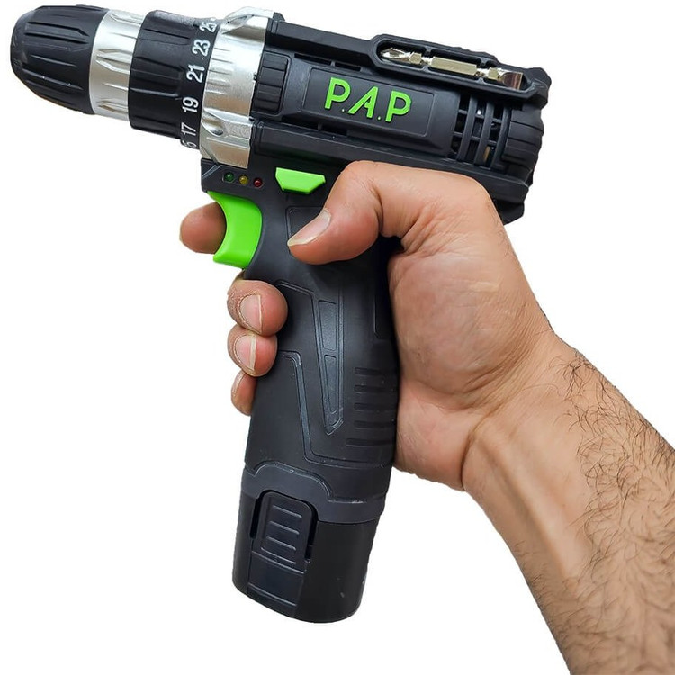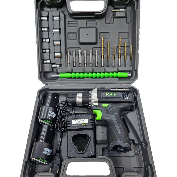 دریل شارژی 12 ولت دو باتری با گشتاور 25 نیوتون و سه نظام 10 میلی متر اتوماتیک یکی از باکیفیت ترین و قدرتمندترین دریل شارژی های 32 عددی برند PAP می باشد. طراحی ارگونومیک این ابزار شارژی از خستگی کاربر در استفاده طولانی مدت جلوگیری می کند.و اصولاً برای کارهای نصب و خانگی کاربرد دارد